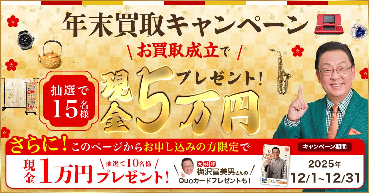 12月31日までに無料査定を申し込むと、抽選で15名さまに現金5万円が当たるチャンス!