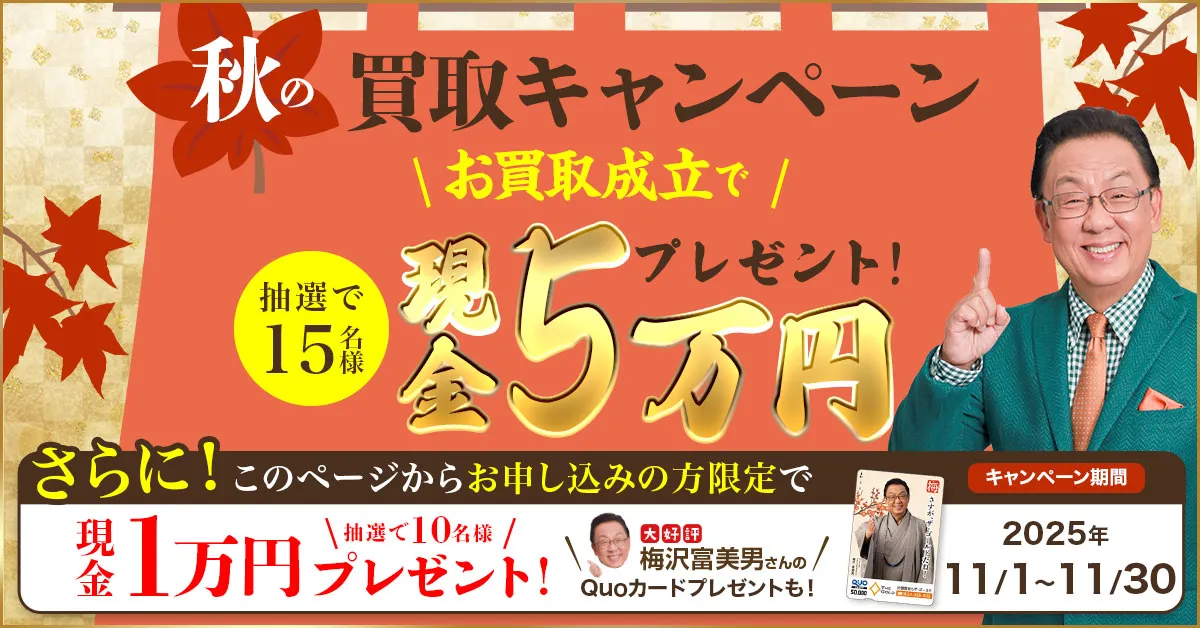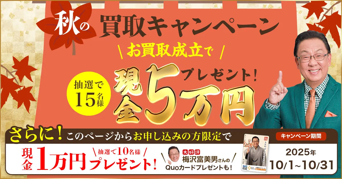 10月31日までに無料査定を申し込むと、抽選で15名さまに現金5万円が当たるチャンス!
